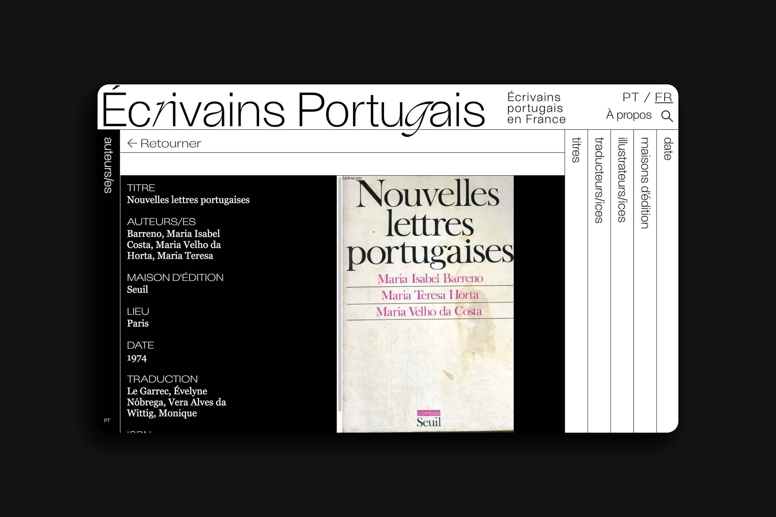 Écrivains portugais en France is an inventory of Portuguese writers translated and/or edited in France which aims to be a tool for researchers, librarians, booksellers, and readers who we wish to see increasing numbers of them. Écrivains portugais en France seeks to contribute to the affirmation of the value and potential of Portuguese authors, a unique heritage and creation that reflects a multifaceted and dynamic reality. The proposed repertoire dates back to 1973, one year before the Carnation Revolution and it will be constantly updated.