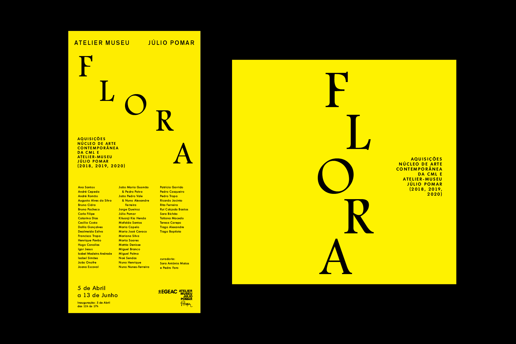 Graphic image for the exhibition FLORA, Aquisições Núcleo de Arte Contemporânea da CML e Atlier-Museu Júlio Pomar (2018, 2019, 2020) curated by Sara Antónia Matos e Pedro Faro. The exhibition, which took its name from a reception of André Romão's works, intended to know the diversity and coexistence of themes and explorations of Portuguese contemporary art, bringing visitors to a direct relationship with the pieces, taking the problems and questions that they raise.