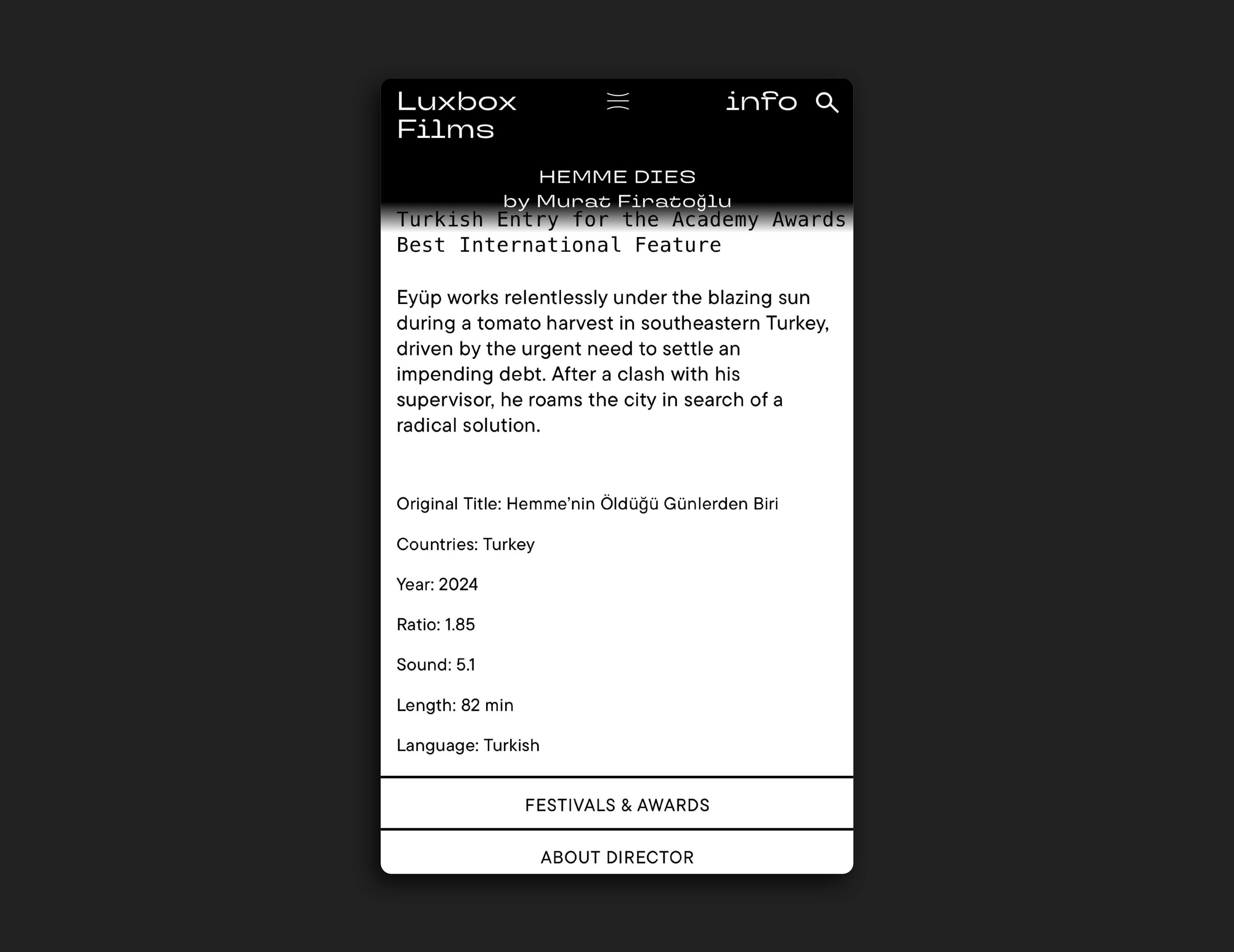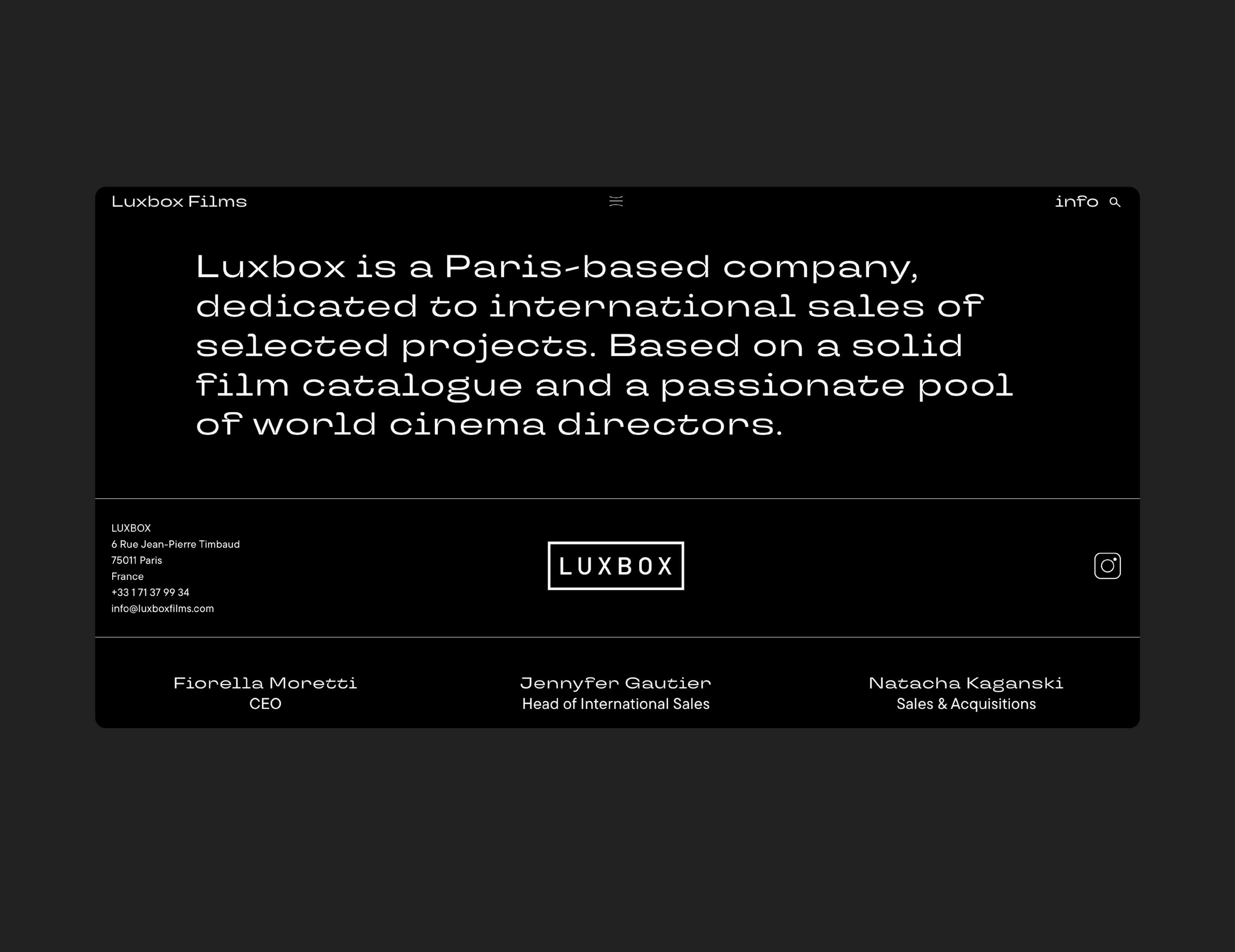 Luxbox is a Paris-based company, dedicated to international sales of selected projects. Based on a solid film catalogue and a passionate pool of world cinema directors.