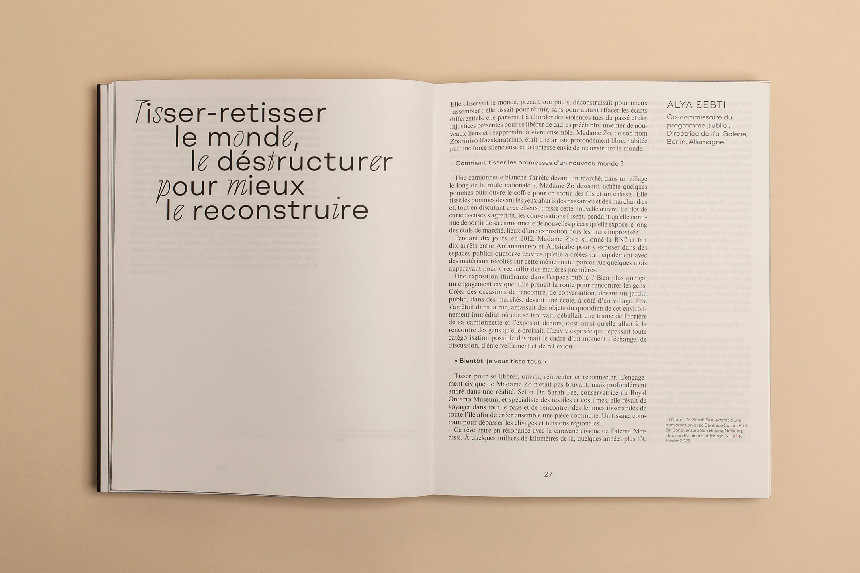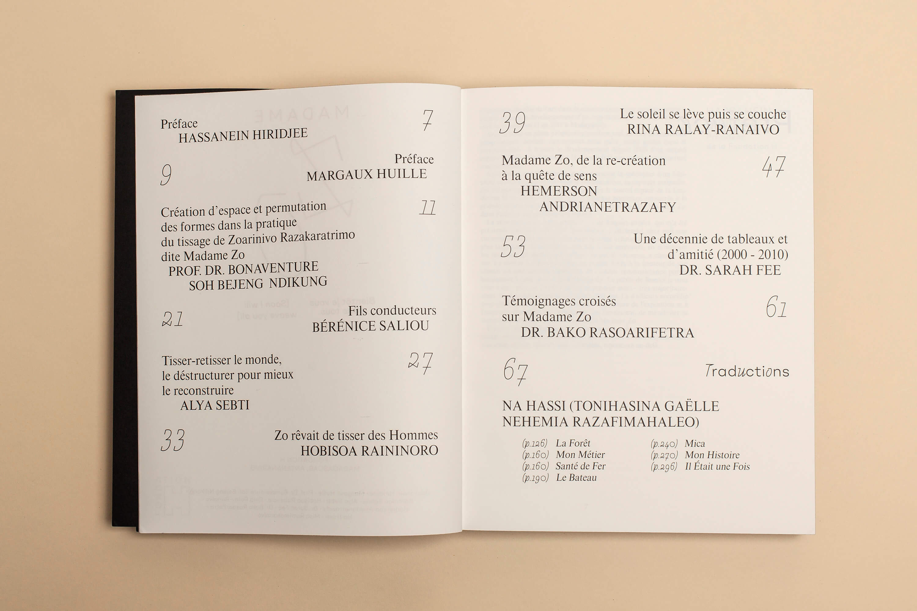 The catalogue reproduces texts by Prof. Dr. Bonaventure Soh Bejeng Ndikung and Bérénice Saliou, co-curators of the exhibition Bientôt je tisse tous vous, Alya Sebti and Hobisoa Raininoro, co-curators of the public programme, as well as texts by Hemerson Andrianetrazafy, Dr. Sarah Fee, Dr. Bako Rasoarifetra, Bérénice Saliou, Alya Sebti and Hobisoa Raininoro, Bako Rasoarifetra, Rina Ralay-Ranaivo, over 80 works by the artist, poems by Na Hassi (Tonihasina Gaëlle Razafimahaleo) written in dialogue with the works of Madame Zo, and several views of the exhibition Bientôt je tisse tous presented in the new space of the Fondation H in Antananarivo, Madagascar.